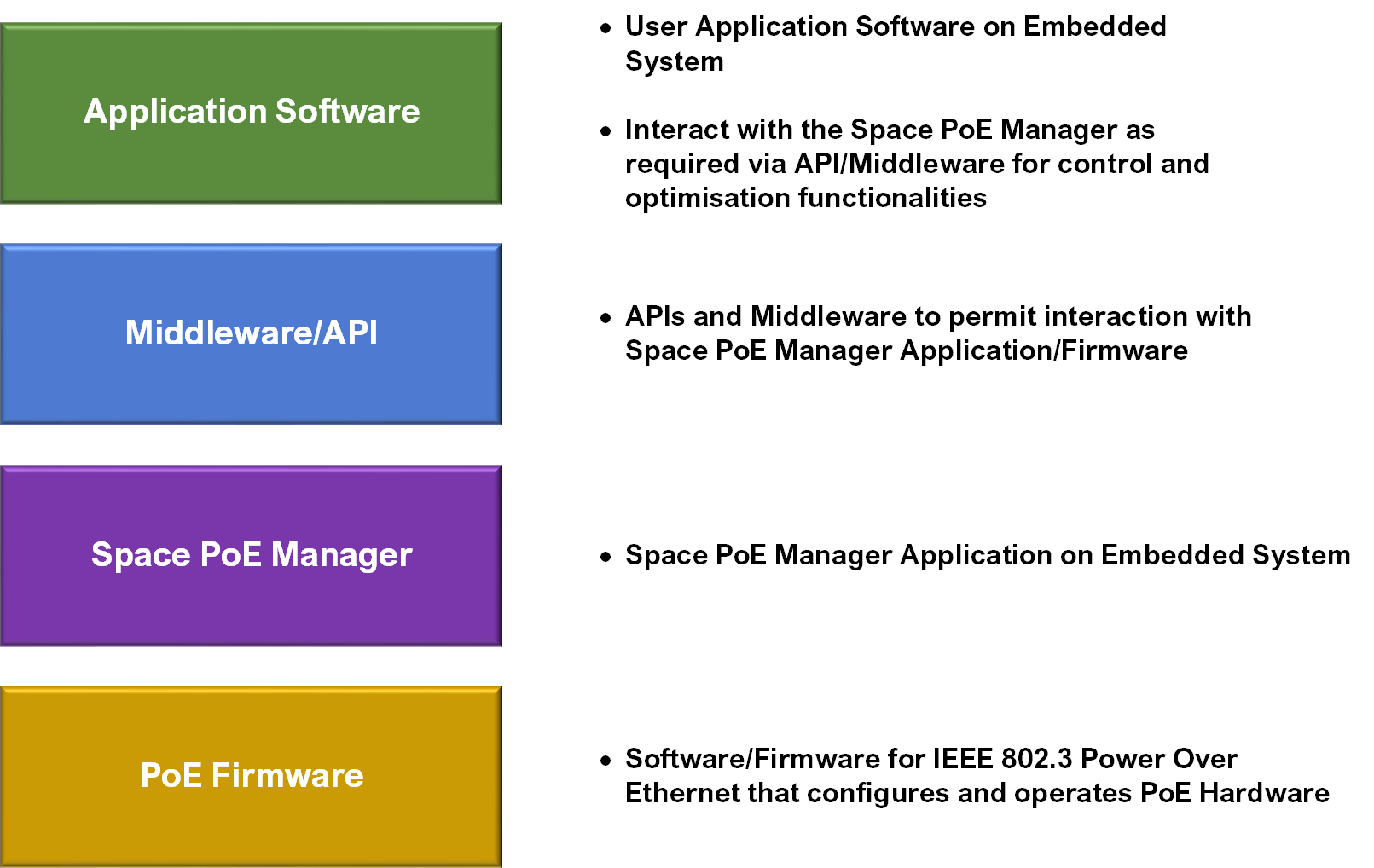 The Space PoE Manager is Deployed as software in an embedded System (On-Board Computer). It is designed so that User Application Software can interact with the Space PoE Manager to command the PoE Controller as required. The Space PoE Manager is provided with an API to provide access to the application for features such as Enabling/Disabling Power Manually or optimising power delivery outside of pre-configured settings.