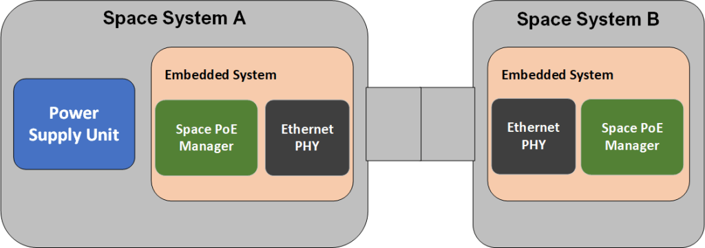 At the point of contact, the Space PoE Manager in Space System A would manage and control the communications initialisation and power transfer to Space System B under the principles of operation below.
