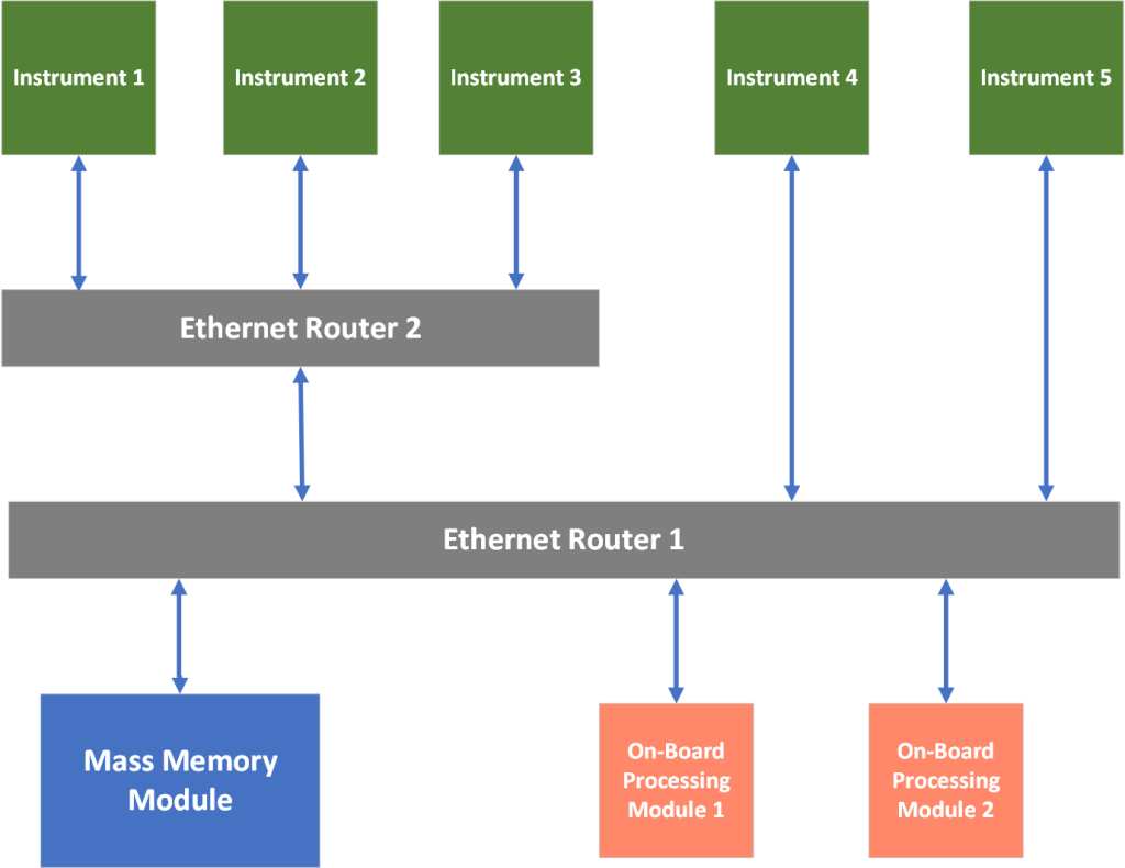 The figure below illustrates a typical network architecture for a space system. In dynamic space operations, these networks frequently undergo significant changes as space systems reconfigure and adjust their topology to meet mission requirements and operational phases. The Dynamic Network Discovery Protocol (DNDP) enables seamless integration between previously undefined networks in-orbit.